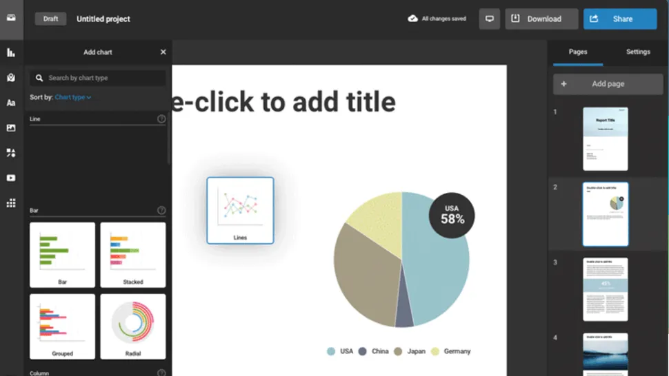Piktochart gibi, Infogram da infografik oluşturma sürecini daha basit hale getirmek için tasarlanmıştır. Verilerinizi sosyal medyada paylaşmak için ideal bir biçimde sunmak için 35'in üzerinde farklı türde çizelge ve harita ile birlikte gelir.Ücretsiz sürüm, ara sıra kullanım için yeterli olabilecek, aralarından seçim yapabileceğiniz giriş düzeyinde bir tema ve düzen seçimi sunar - ancak görselleştirmek için sürekli bir veri akışınız varsa, ücretli sürüm seçimi genişletir ve en önemlisi, ayrıca şunları sağlar: İnfografiklere logonuzu eklemeniz gerekiyor.Pro sürümü size ayda 19 ABD doları veya gerçekten ileri düzey kullanıcılar için İş sürümünün aylık maliyeti 67 ABD doları getirecektir. Üçüncü bir katman da var – Enterprise sürümü – ancak bir fiyat teklifi için ekiple iletişime geçmeniz gerekecek.